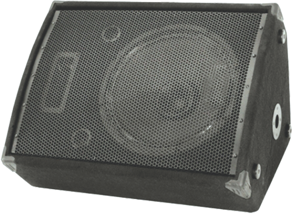 Compact 2-Way Floor Monitor speaker system comprising of a single 15" (200 W) Full Range Dual Cone Speaker and a Piezo Horn Tweeter. The unique multi functional trapezodial design of the enclosure for effective floor monitoring in various indoor and outdoor applications. The system is housed in an acoustically treated Bass Reflex enclosure made of 18mm board and carpet covered. An On/Off switch for piezo speaker is provided to limit extended HF, if desired. Stand mount adaptor is provided at the bottom.